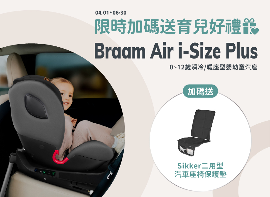 獨家好禮送!4/1~6/30活動期間加碼送保護底墊!# Braam Air i-Size Plus嶄新升級!結合「#風扇暖座雙控 」「#智能安裝指示燈」不論夏季酷熱或冬日寒冷,也能保持座椅內舒適恆溫,呵護每一程旅途!