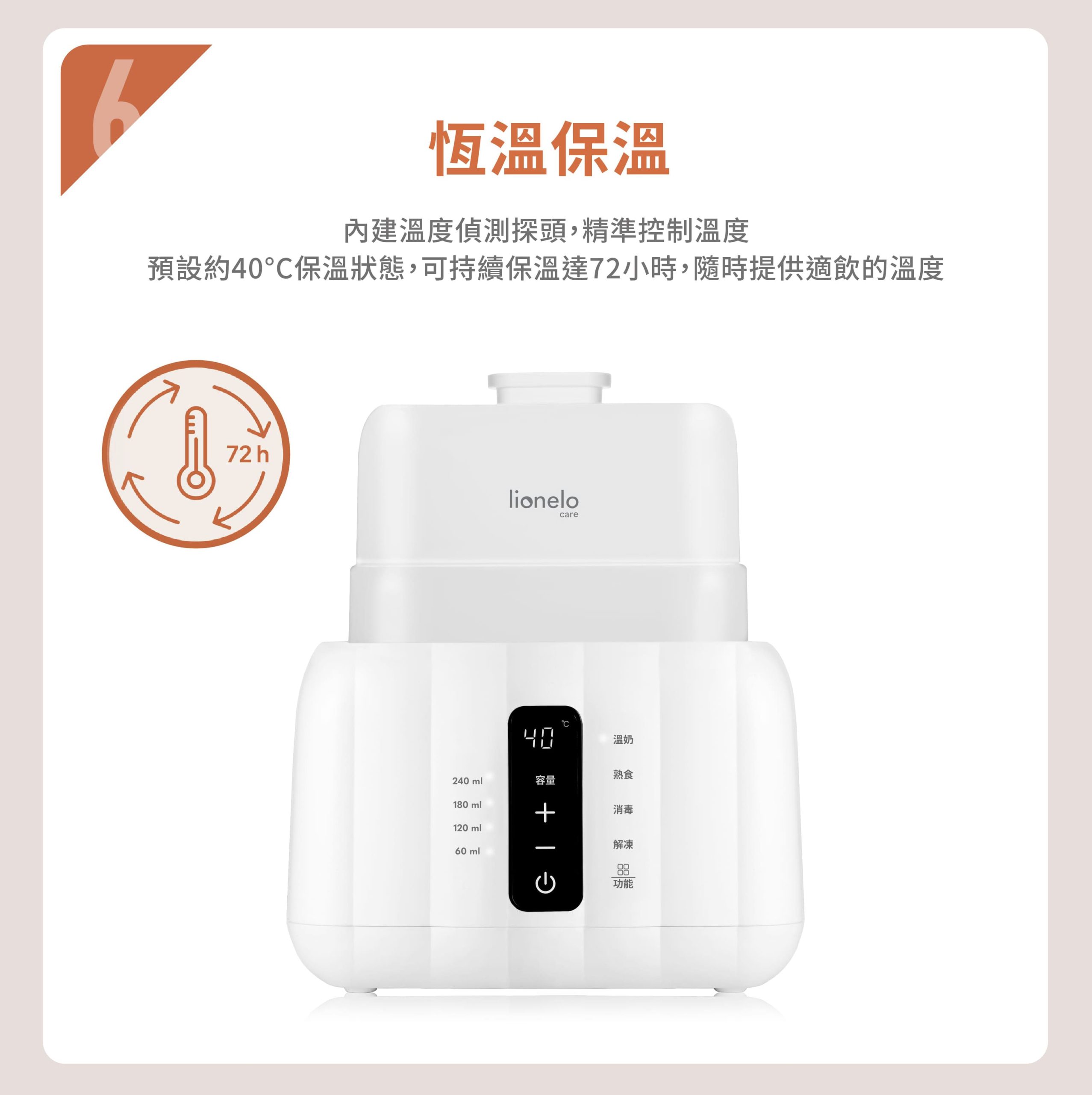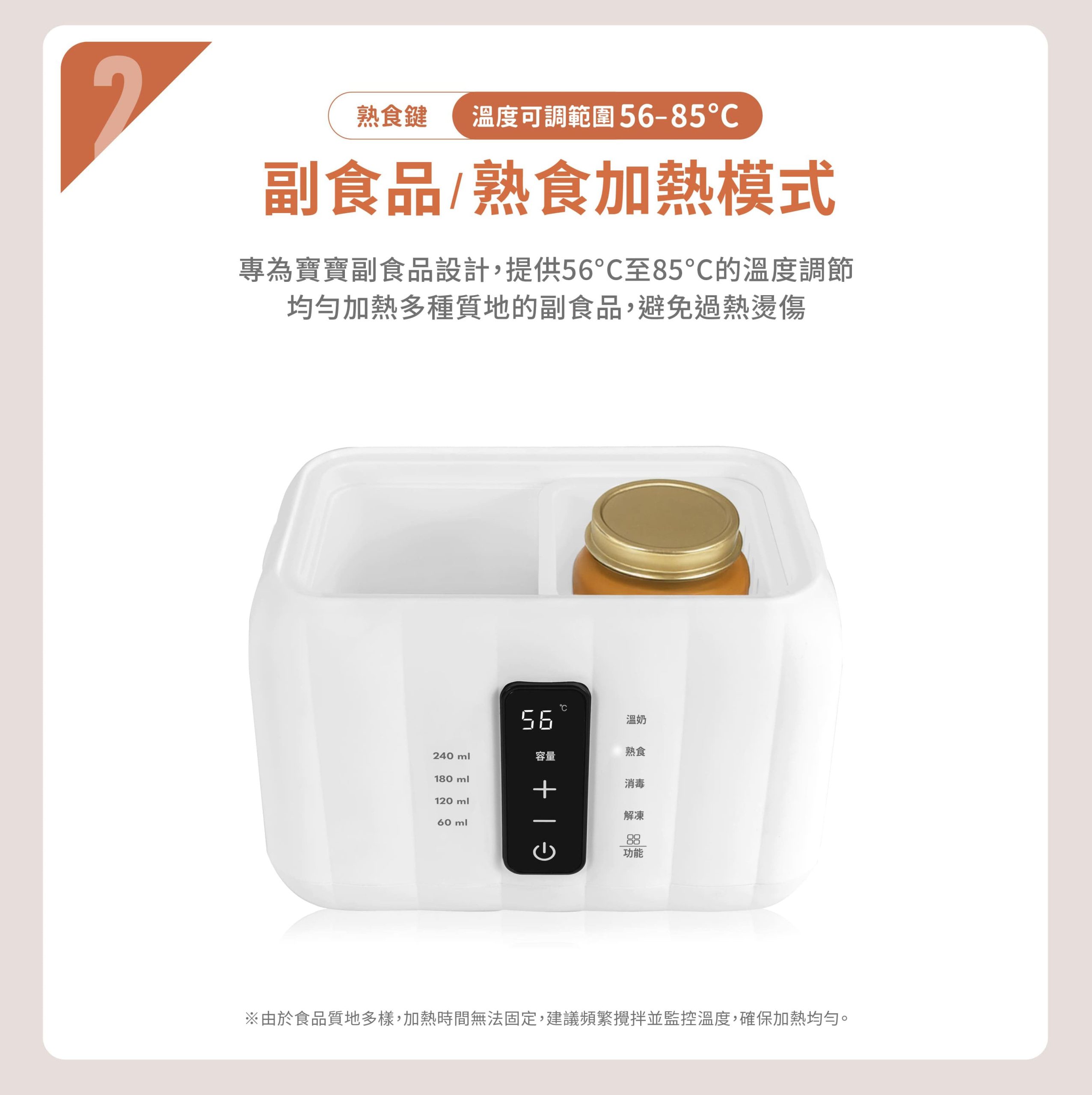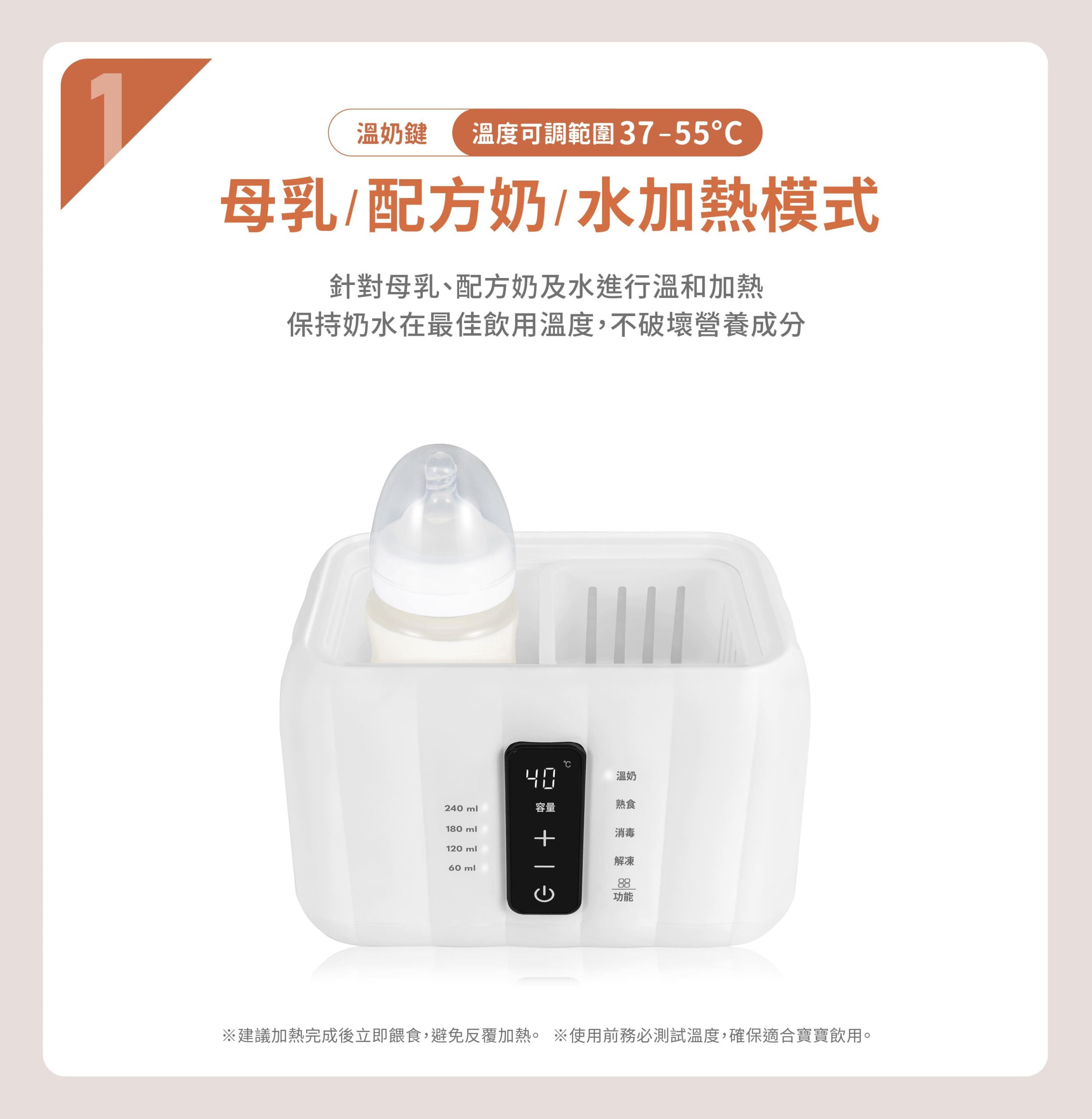• 標準溫奶、加熱熟食、快速加熱、蒸氣消毒、優化解凍、恆溫保溫六種功能