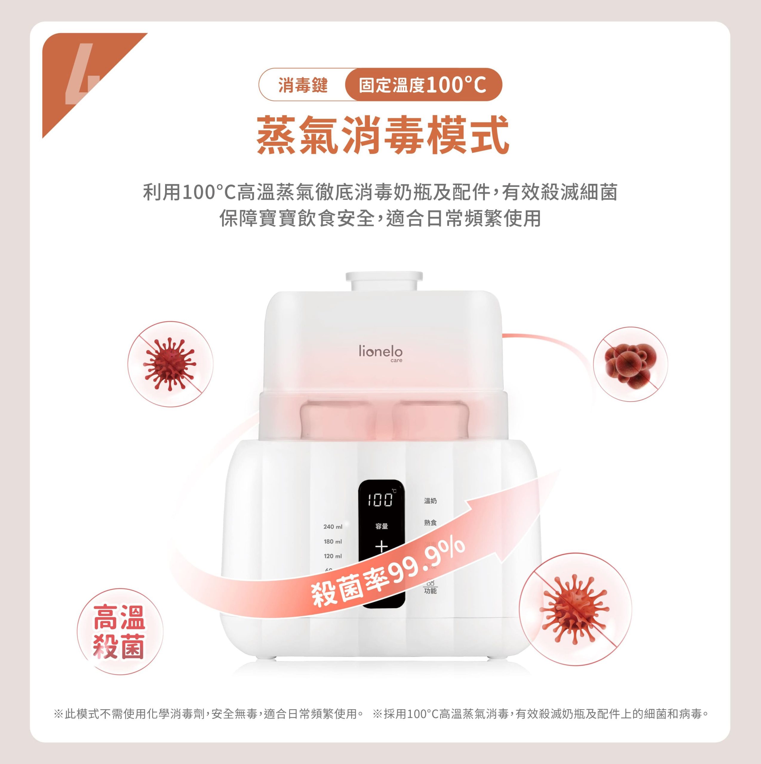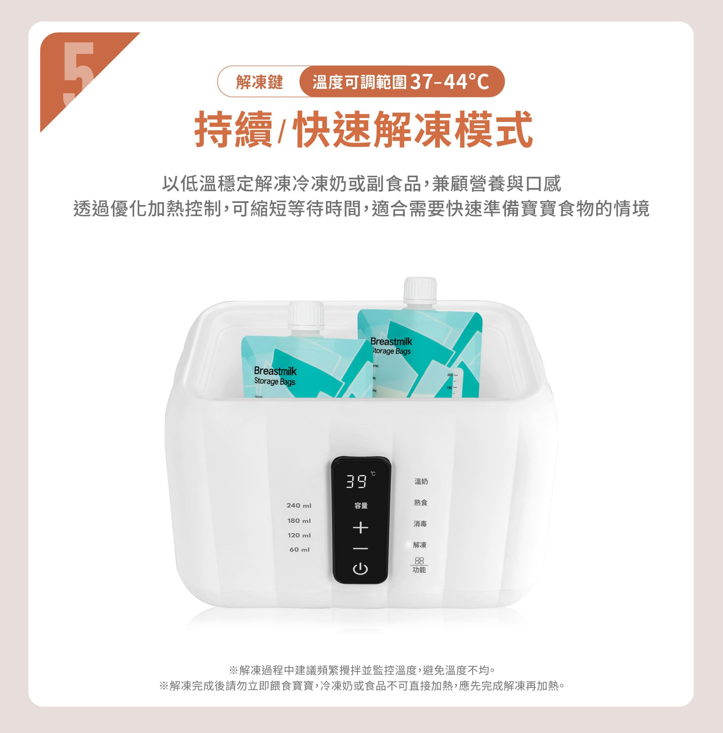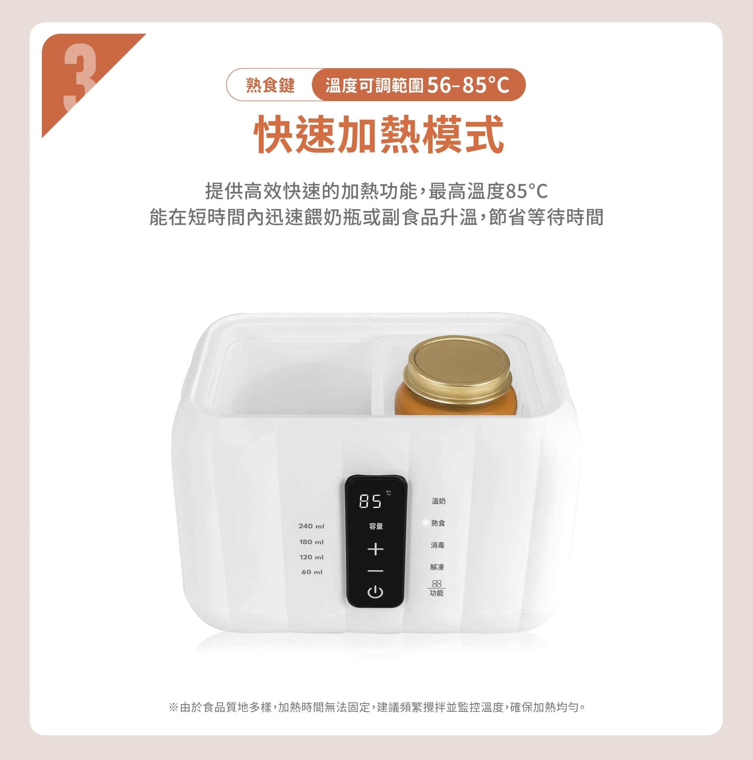 • 標準溫奶、加熱熟食、快速加熱、蒸氣消毒、優化解凍、恆溫保溫六種功能