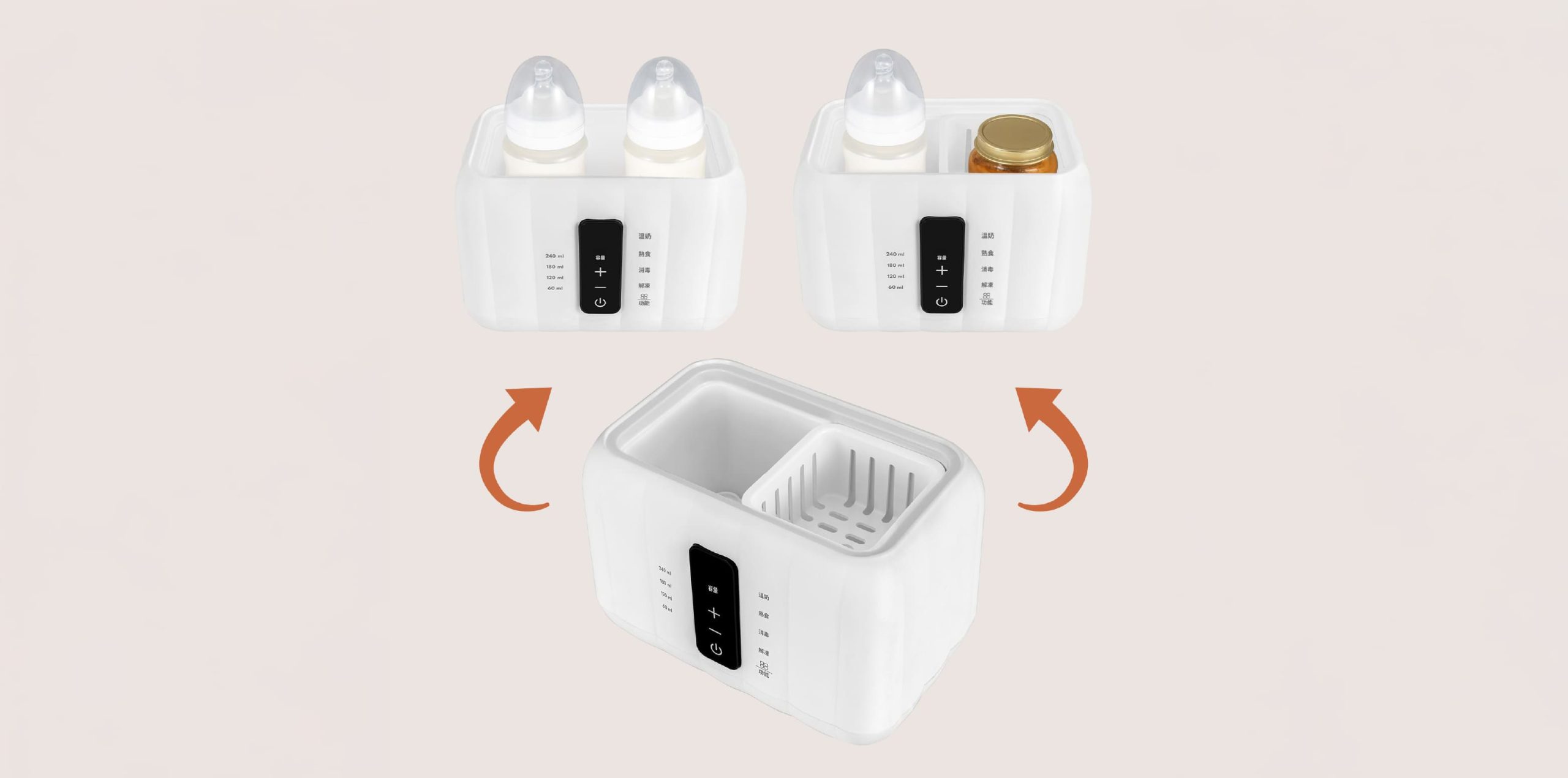 可同時容納兩個奶瓶或副食品容器,加熱與消毒一次完成