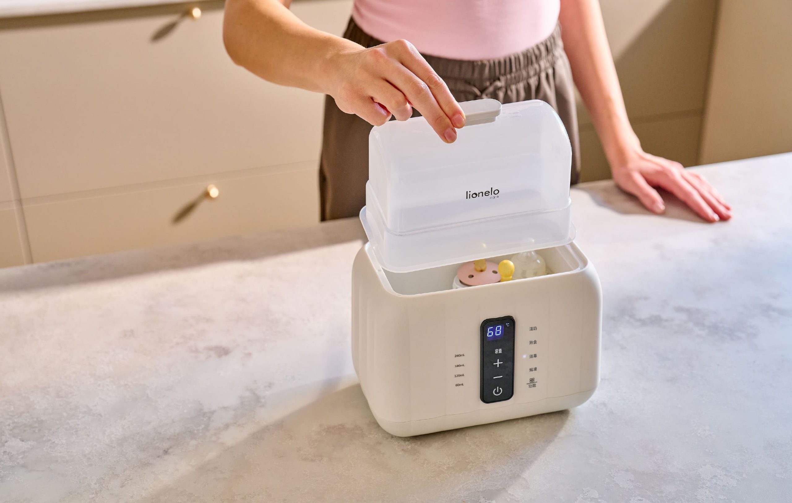支援雙奶瓶溫奶器設計,一機整合功能包含母乳/配方奶/水加熱、加熱副食品、快速加熱、100度蒸氣消毒、解凍與恆溫保溫。多功能溫奶器一鍵操作,適合新手爸媽使用。體積輕巧好攜帶,外出旅遊、露營皆適用,快速準備適溫奶水與副食品,內建奶瓶消毒功能,可單獨消毒奶瓶,避免與他人共用消毒鍋,更加安心。